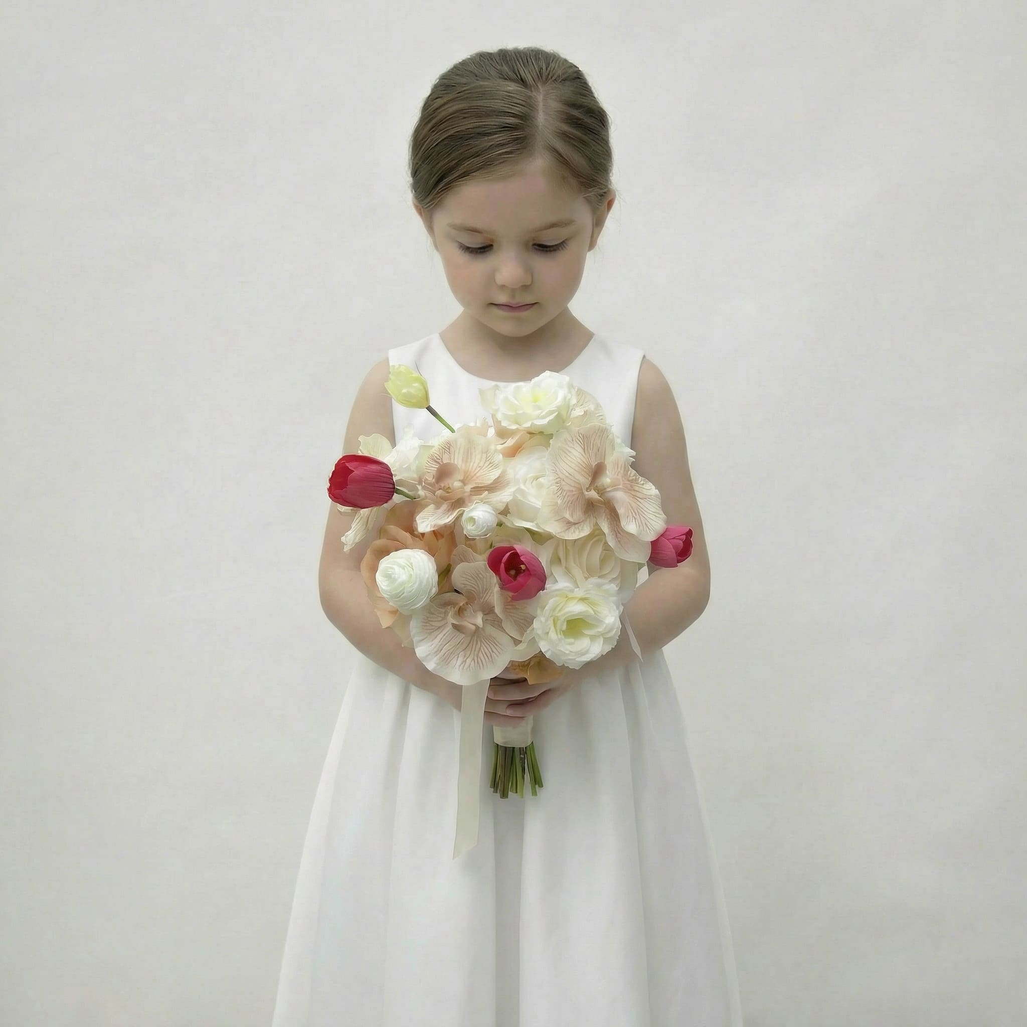 Lightweight and perfectly sized for little hands, the bouquet adds a joyful and graceful moment as your flower girl walks down the aisle. The neutral palette ensures the design blends seamlessly with the rest of the wedding florals while maintaining its own delicate charm.