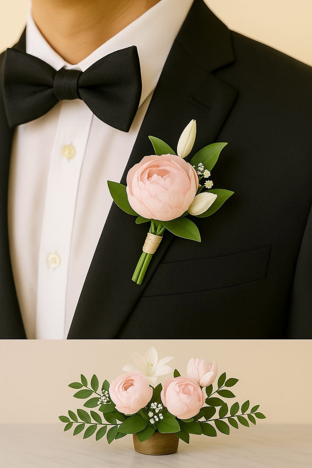 Whether you’re styling an intimate ceremony or a grand celebration, the soft bloom peonies and lilies groom & groomsmen buttonhole wedding adds balance, texture, and romance. It pairs beautifully with neutral, pastel, or champagne palettes and complements modern, classic, or boho themes.