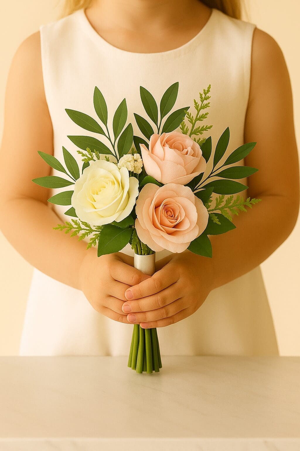 The Wild Petal Greens Roses and Peonies wedding flowers Bundle is designed for couples who want their entire wedding day to feel seamlessly coordinated. Featuring radiant golden spray roses and elegant lilies, each piece — from aisle markers to bridesmaids bouquets, flower girl posies, buttonholes, and the top table centrepiece — is styled to complement the bridal bouquet. This ensures that every floral detail across your celebration carries the same romantic, golden-toned beauty.